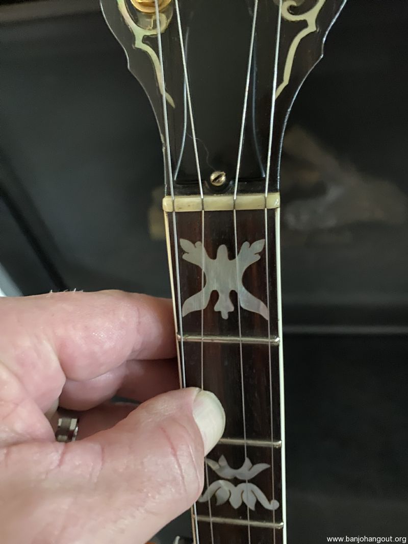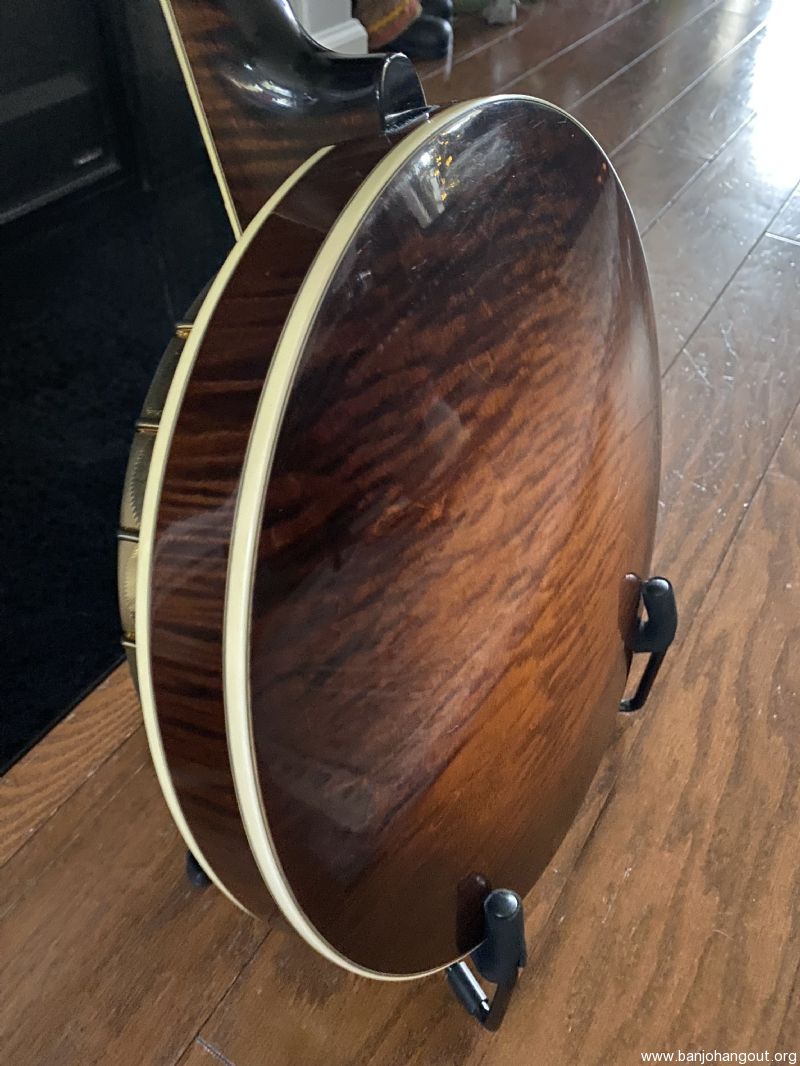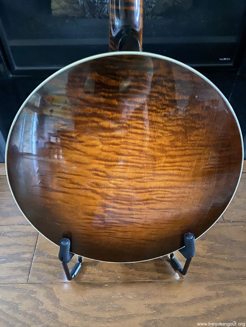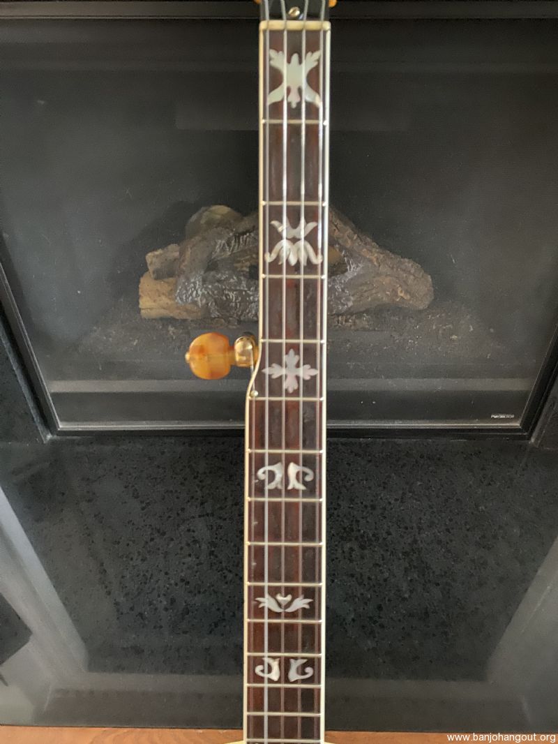 The banjo is all original withe the exception of the tail piece, tuners & buttons that are currently on the banjo. The original tail piece which was cracked has been replaced and the original cover remains on the banjo. 2nd and 3rd strings currently have Schaller D-tuners and all buttons have been replace with antique styled amber buttons. All original tuners, buttons and tailpiece will come with the banjo.