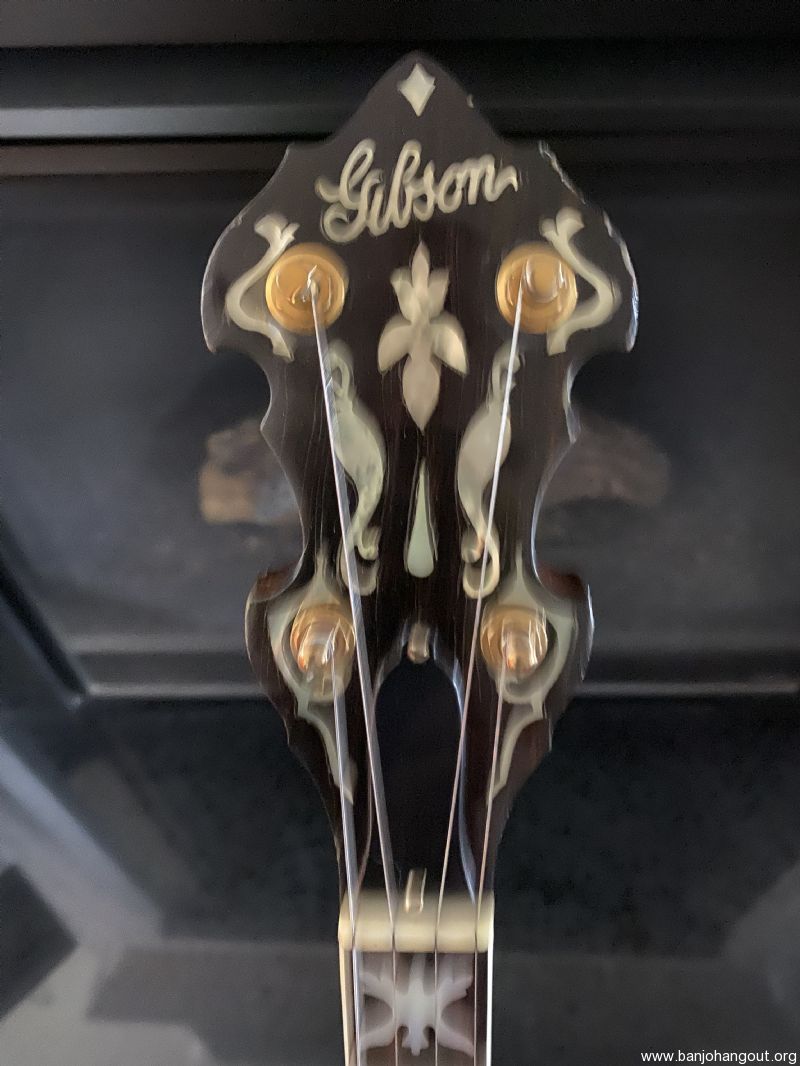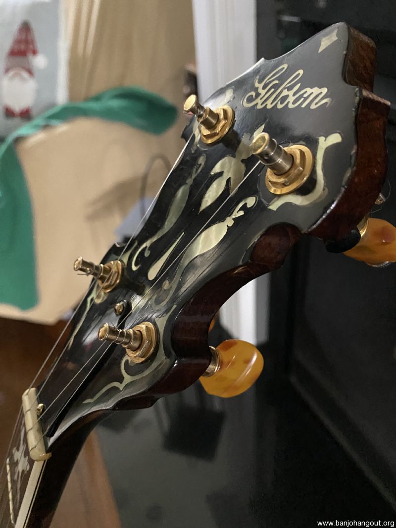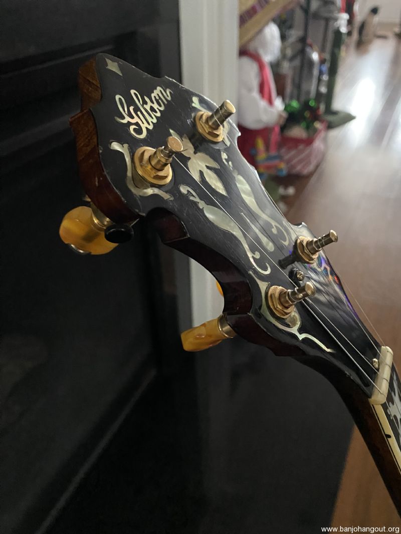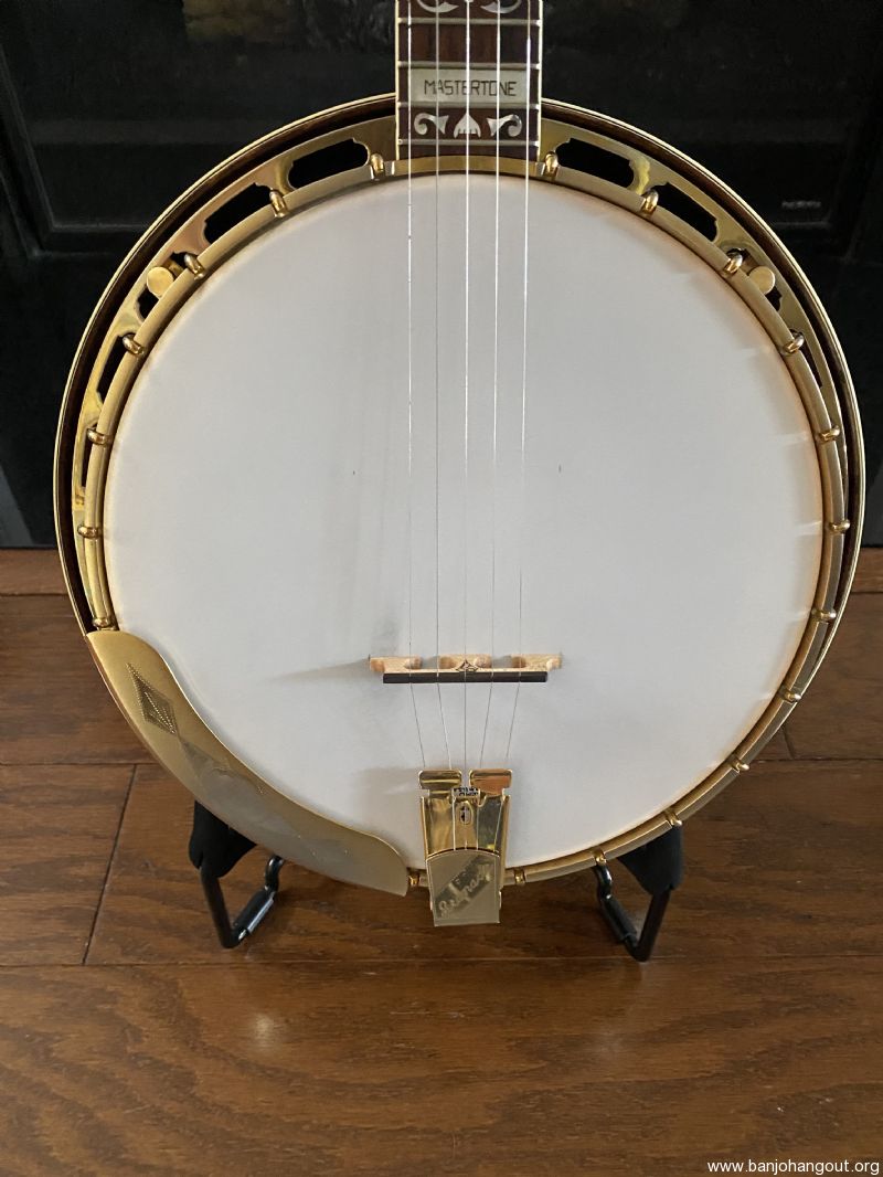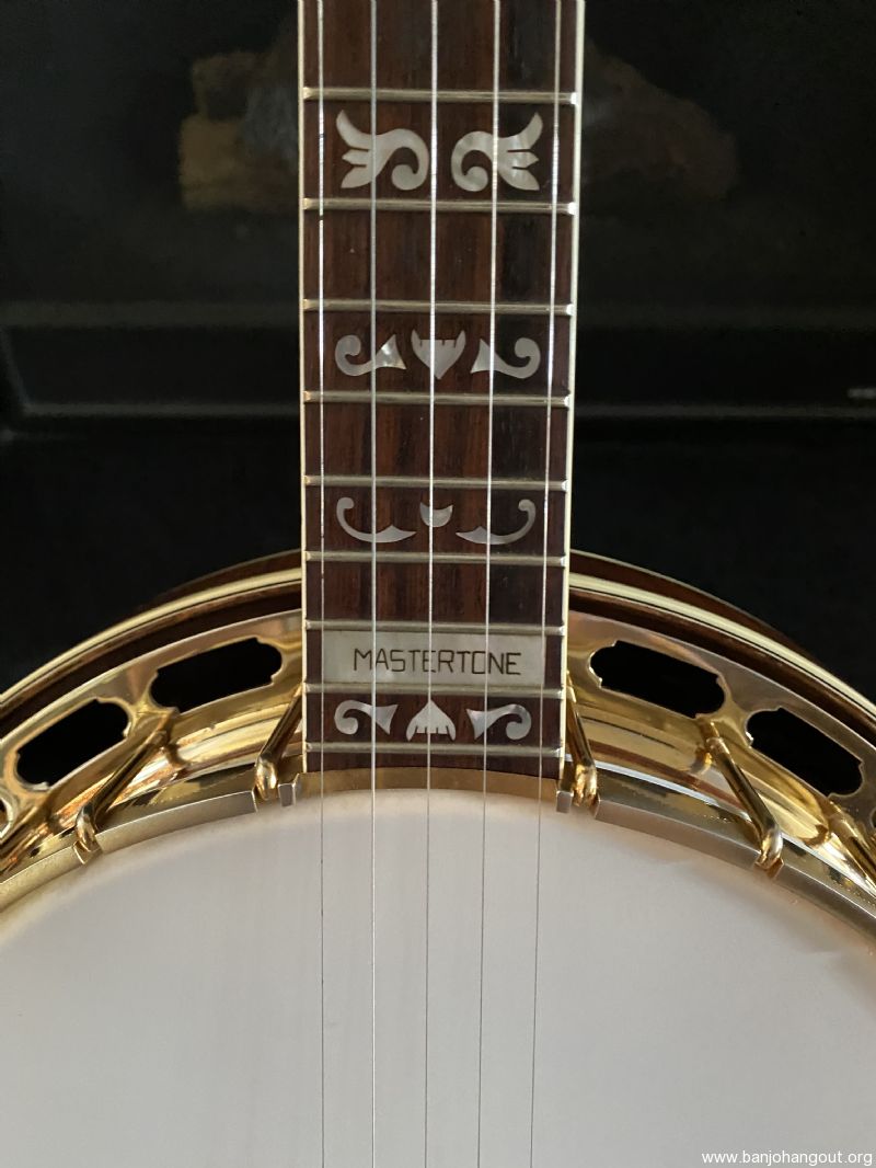 The banjo is all original withe the exception of the tail piece, tuners & buttons that are currently on the banjo. The original tail piece which was cracked has been replaced and the original cover remains on the banjo. 2nd and 3rd strings currently have Schaller D-tuners and all buttons have been replace with antique styled amber buttons. All original tuners, buttons and tailpiece will come with the banjo.