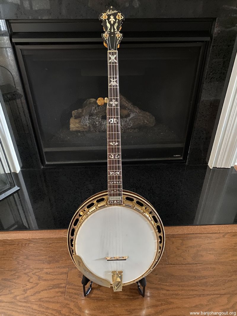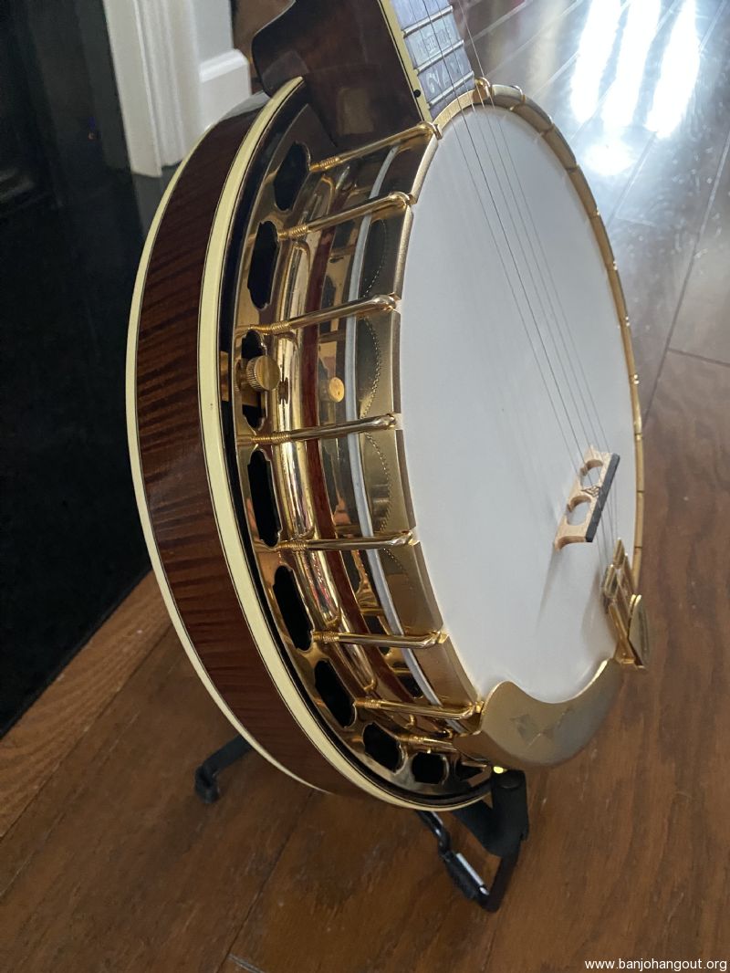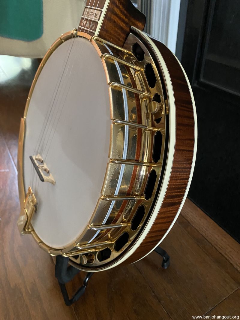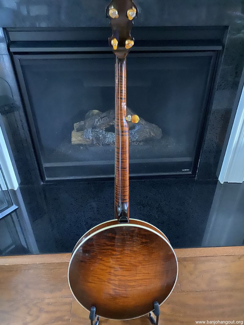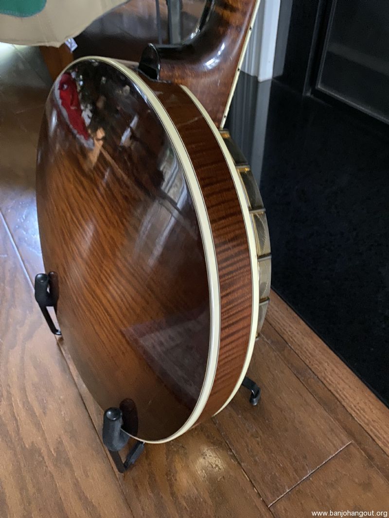 The banjo is currently set up with Huber strings and head, Snuffy Smith bridge and spikes at 7-10.