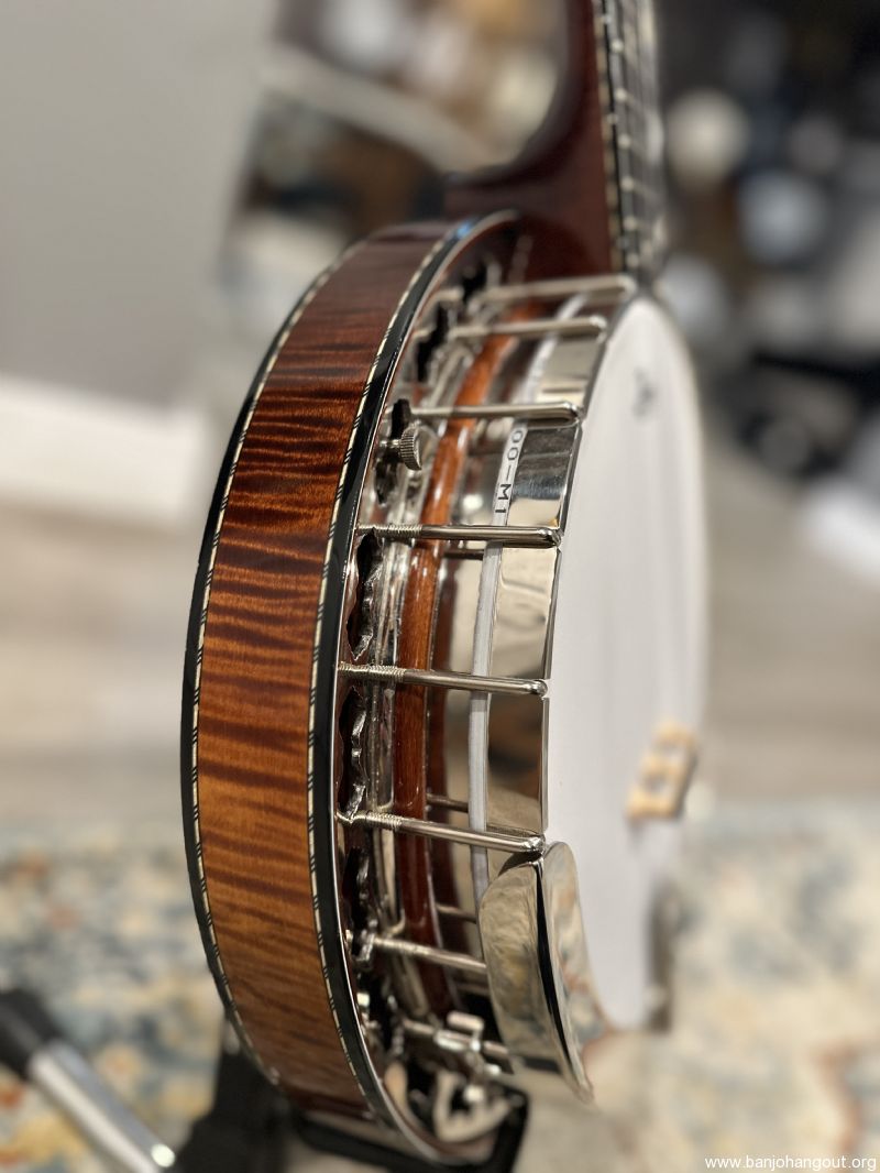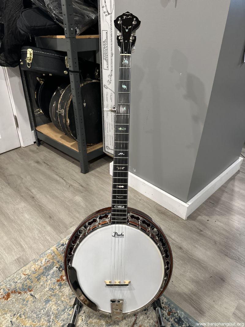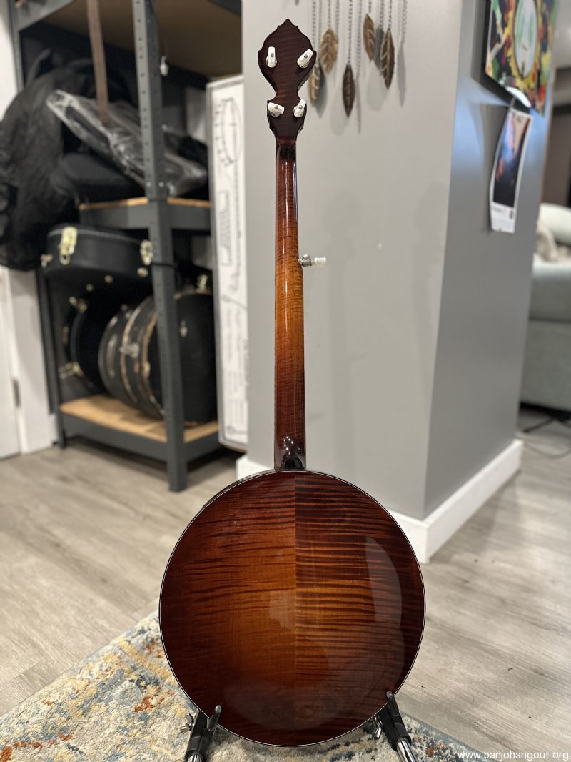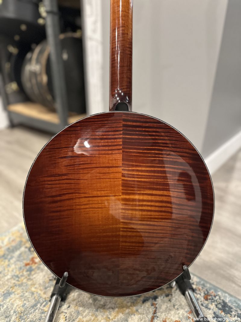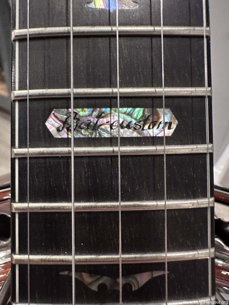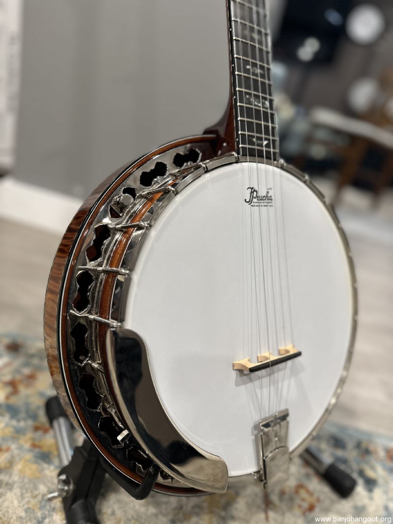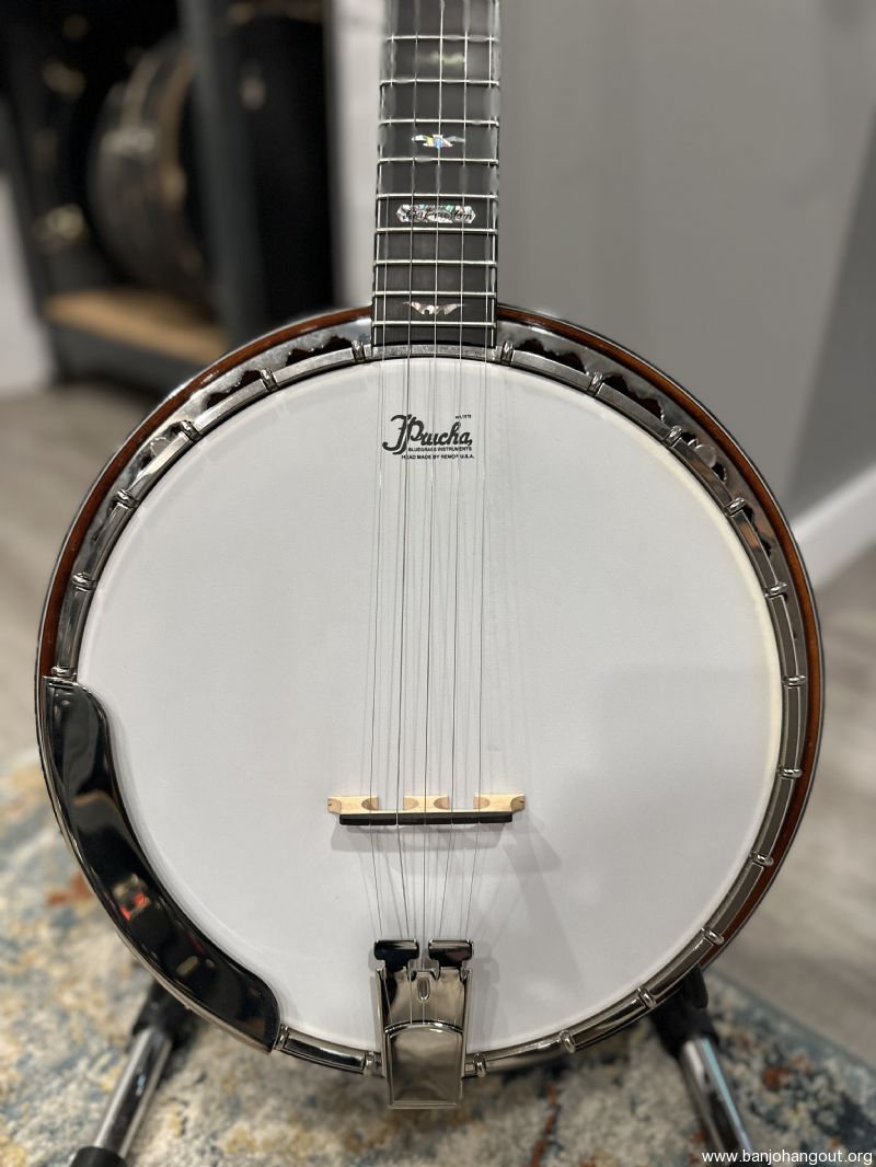 Highly figured Maple neck and resonator. Neck has Ebony peghead overlay and radiused fingerboard. Prucha’s own Bat inlays in peghead and fingerboard. Nickel Hardware. Five-star tuners in peghead, Schaller 5th tuner, all with pearloid buttons. Reversed black/wh/blk multiple bindings around resonator and fingerboard, with wooden marquetry strip purfling under the bindings. Resonator has a solid wood bookmatched back that has been tuned by Mr. Prucha to add presence to the overall sound.