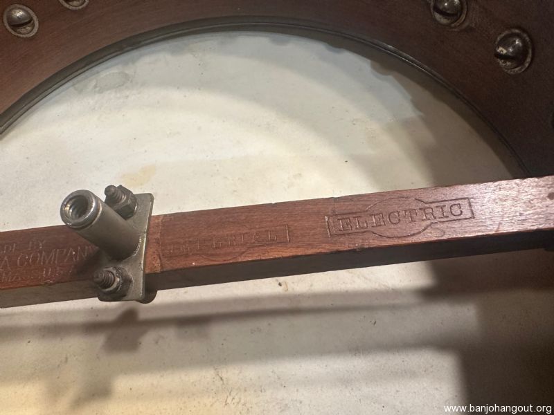 This is an interesting and fairly rare 1920s example of an "Imperial Electric" Banjo, made not long after the venerable Fairbanks trade name was finally discontinued in favor of just "Vega". It is stamped "made by The Vega Company" and "Imperial Electric" on the dowel with several patent numbers. That name dates to the 1890s and refers to the tone ring style, not actual electricity! By 1923 this was the oldest pro-grade model in the Vega line, patented in 1893 when electricity was a novelty!
