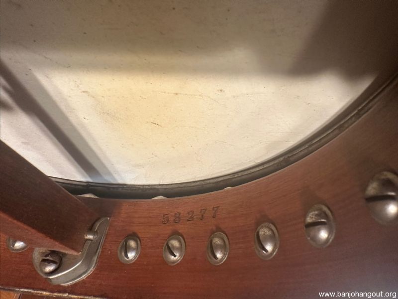 The one-piece mahogany neck has an ebonized maple fingerboard, heelcap, and headstock facing, as well as bone nut and pearl dot-and-diamond inlay. The bottom edge of the rim was lacquered black, and the tailpiece is a true 5-string No-Knot. This banjo is equipped with an original Vega pie-plate resonator, close fitted with no flange. This can be easily removed if desired for playing as an openback.