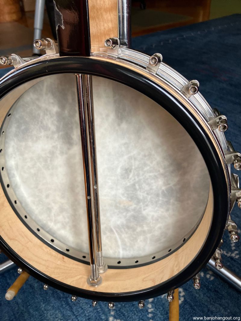 Genuine Vega tubaphone tone ring three ply rock maple rime capped in black Curly hard rock maple neck Ebony fingerboard Two trus rod Mother of Pearl inlays Slender fast comfortably shaped neck Planetary banjo tuners Standard 11" frosted head Nickel plated